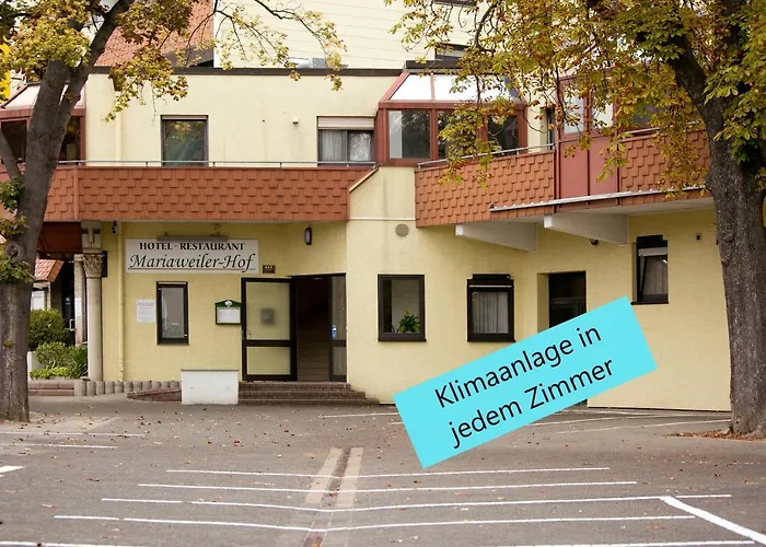 Das 3-Sterne-Hotel Mariaweiler Hof Düren - Eifel bietet 26 Zimmer und liegt in ca. 20 Gehminuten Entfernung vom See Duerener Badesee. Das gehobene Hotel verfügt über WLAN in den öffentlichen Bereichen und bietet außerdem ein Restaurant.